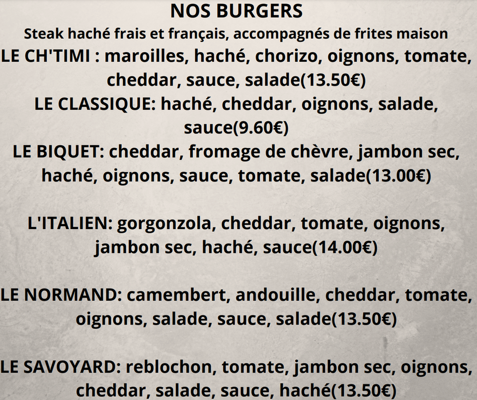 Dans le centre ville de Lisieux, nous vous proposons dans un cadre moderne et chaleureux une carte de pizzas, burgers, viandes, salades et frites maison !